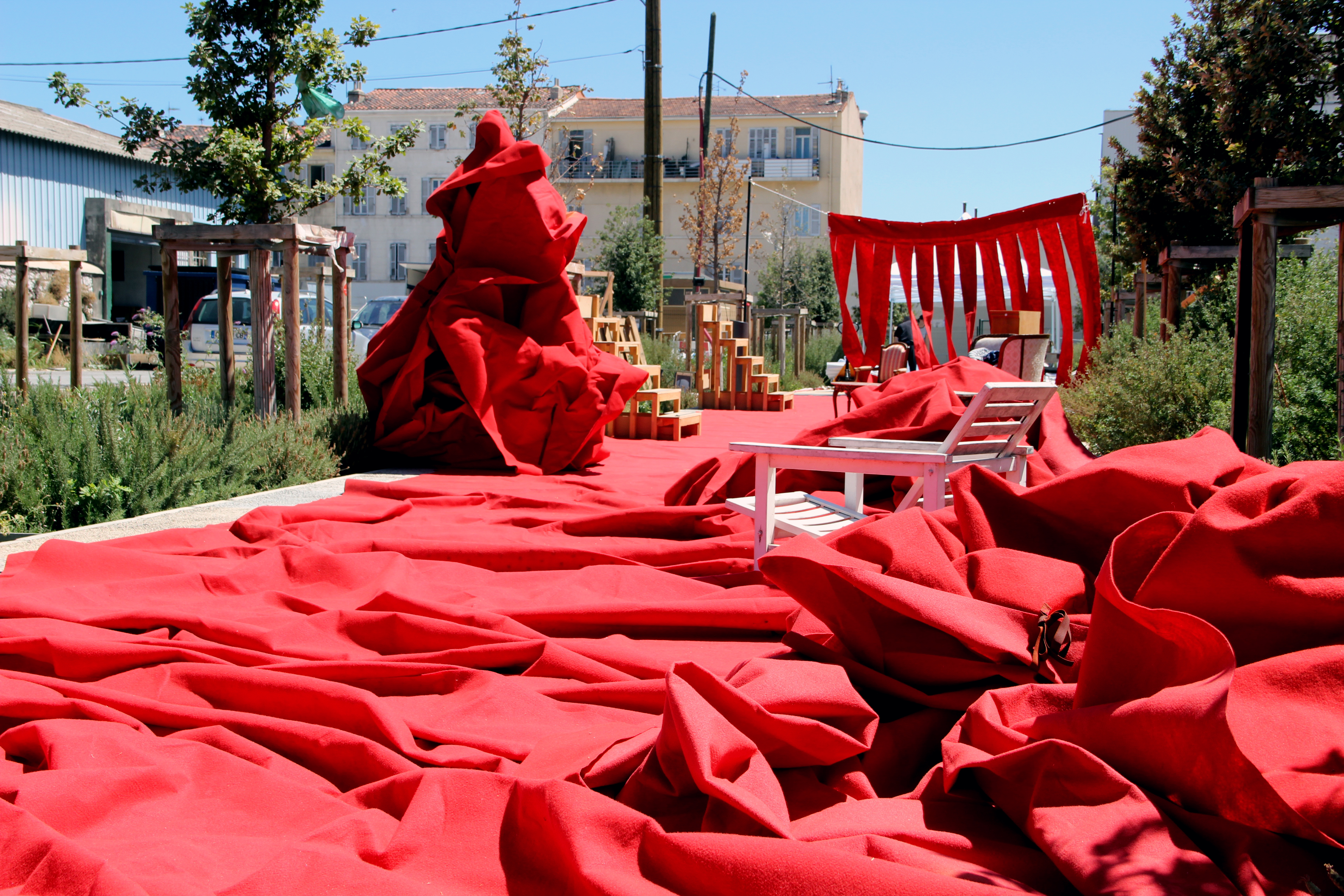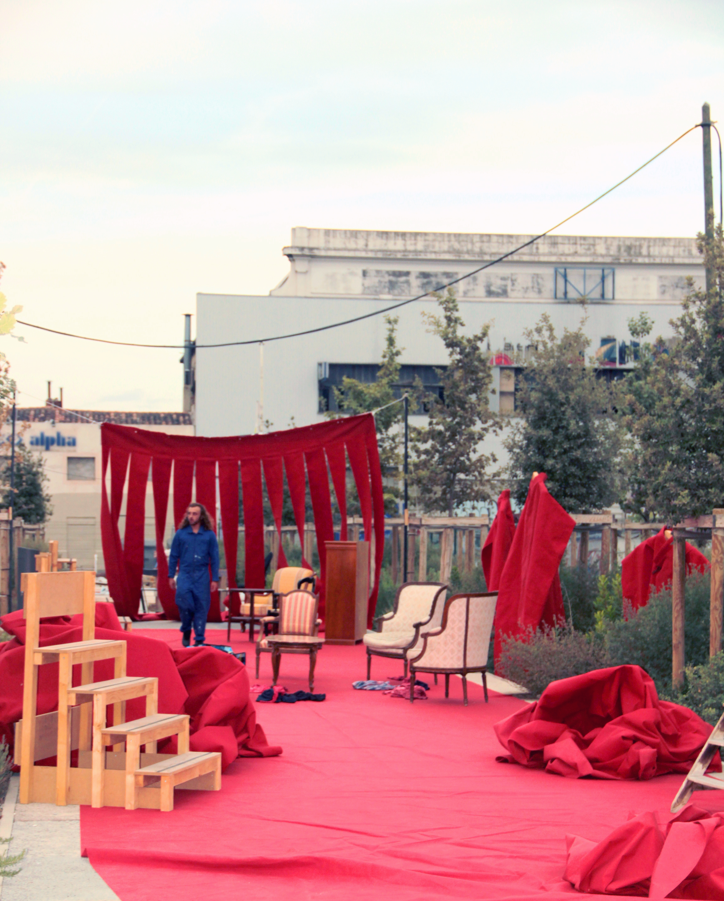 Le réemploi et le travail à partir de la matière sont des principes inhérents à mes créations scéniques. Quand la Réserve des Arts Sud a mis en vente du tapis rouge récupéré au Festival de Cannes, j’ai très vite eu envie de faire une scénographie avec cette matière symboliquement très forte. En effet, le tapis rouge délimite une zone, celle des « VIP ». Il y a ceux qui ont la chance de le fouler, et ceux qui font partie d’une foule anonyme et qui gravitent autour, avec l’envie certaine ou le fantasme de pouvoir un jour, passer de l’autre côté. Or, voilà que ce socle de la réussite se trouve mis au rebut, comme un vulgaire déchet. Cet aller-retour entre la réussite et la déchéance a éveillé en moi le désir d’en faire une scénographie pour une pièce de théâtre qui traiterait de cette question.