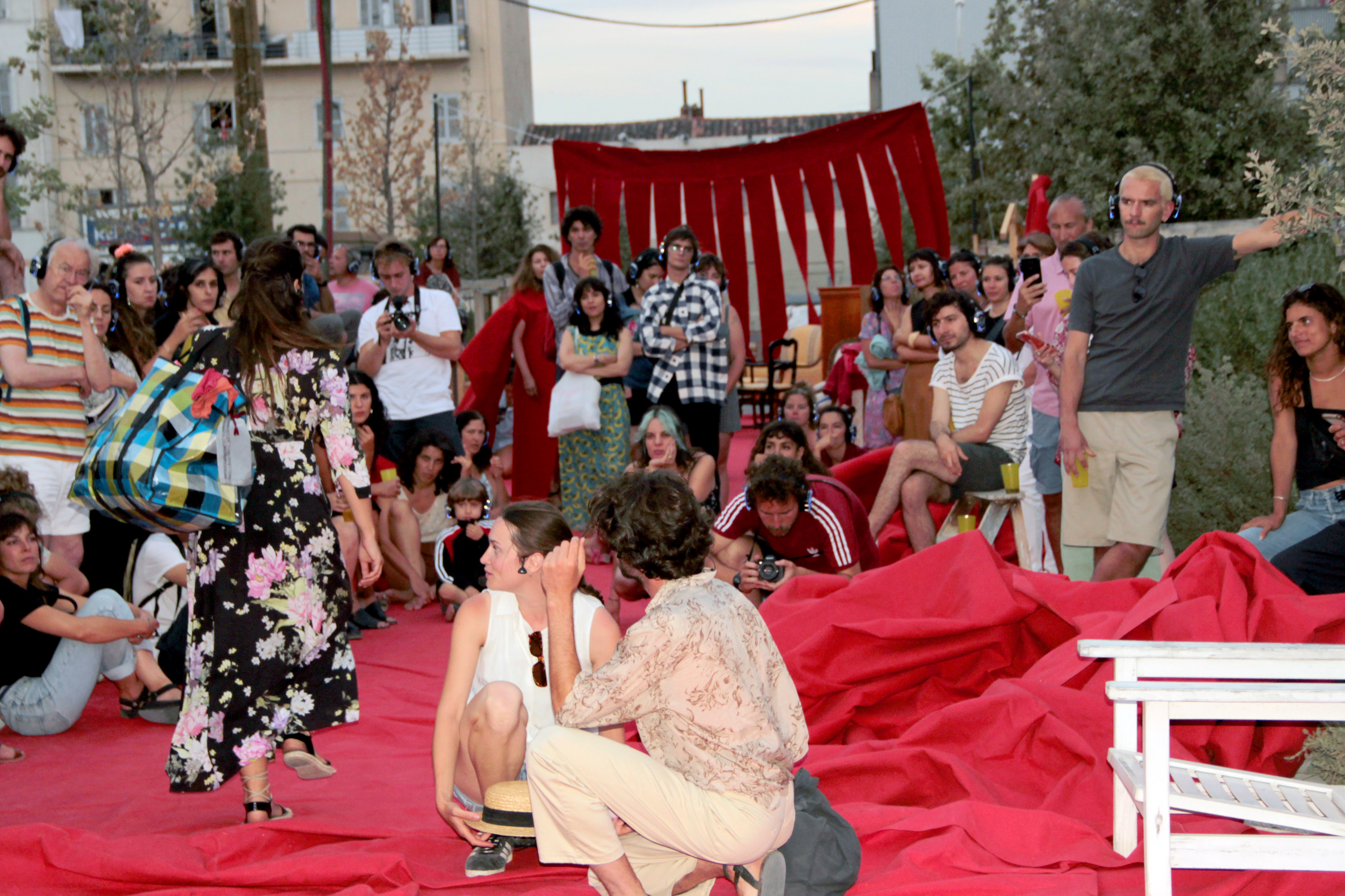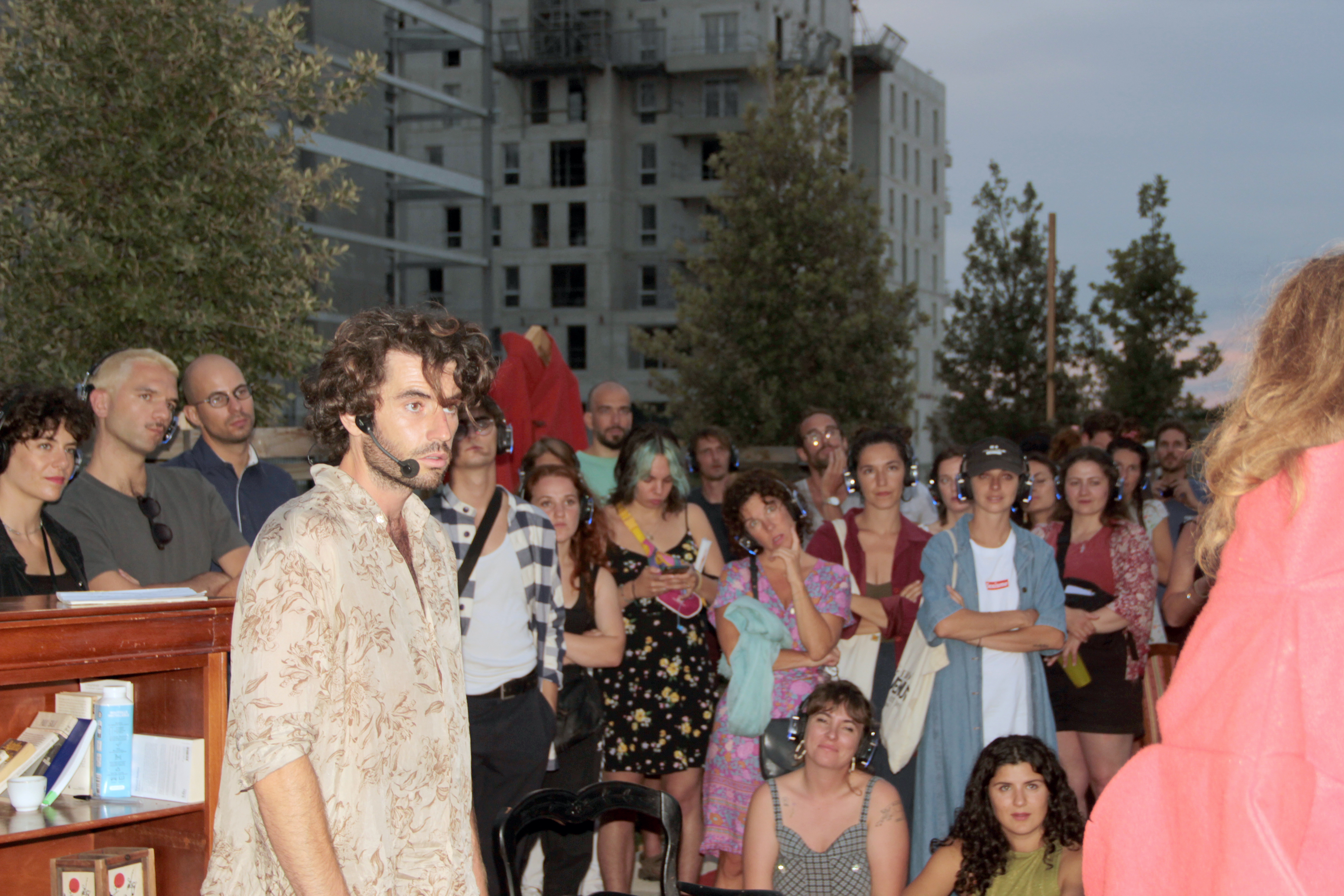 J’ai donc commencé par réfléchir dans l’ordre à la scénographie, au dispositif scénique, puis à la mise en scène de la pièce. Pour réaliser la scénographie de ce projet et entamer sa mise en scène, j’ai effectué une résidence de quatre mois à la Réserve des Arts Sud. Le résultat est une installation scénique extérieure pour un spectacle de théâtre déambulatoire et immersif. Nous avons fait une sortie de résidence le 30 juin 2022, pour laquelle nous avons donné une représentation d’1h à un public d’une soixantaine de personnes de tous âges. Les retours ont été très positifs, ce qui encourage une création à venir.